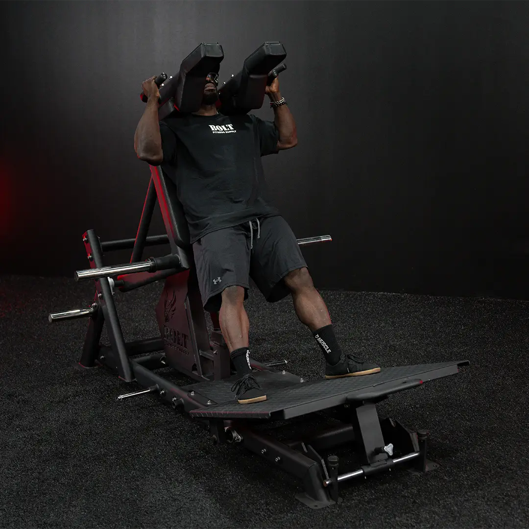 These two positions are not the only adjustments available to athletes using the Tank. The diamond-tread footplate has two pin ports that provide the user with 4 inches of upward tilt, and its sheer size—38 inches by 27.5 inches—offers a variety of foot positions from which to lift the Tank's impressive 675-pound capacity that can be further intensified with resistance bands attached to the four band pegs at the machine’s base. If that’s not enough and you need even more weight, you can add Savages which are heavy chains available from our online store.